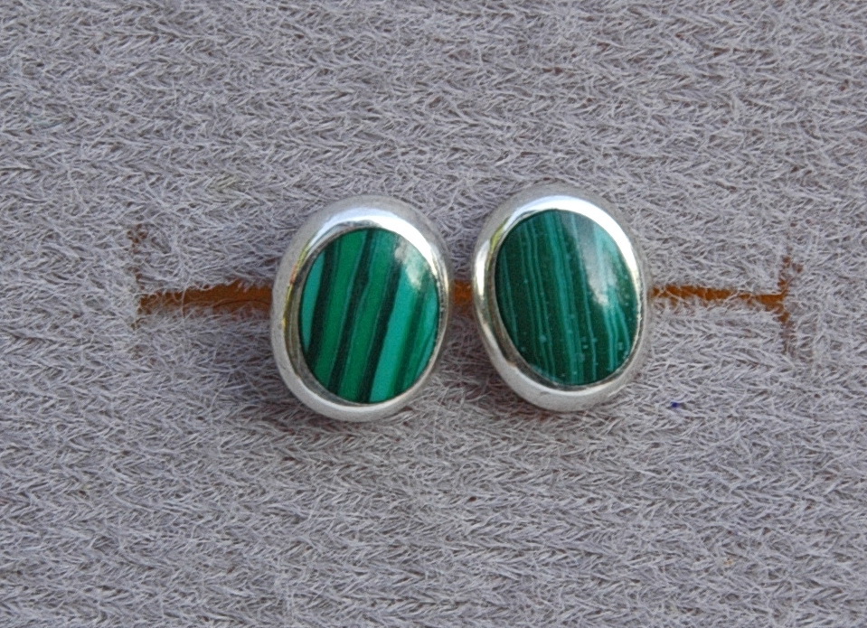 Dieses Ohrsteckerpaar ist schlicht gefasst mit schön gemasertem Malachit in Silber 925. Ohrsteckerstift und Gegenstecker sind ebenfalls aus Silber 925.