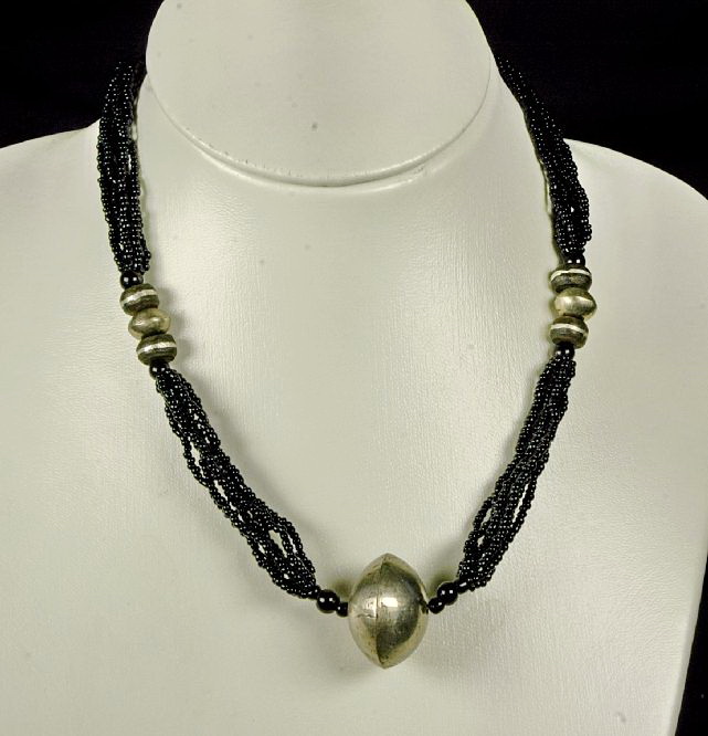 Traditionelle Halskette mit schönen handgefertigten Silber und Ebenholzperlen, dazwischen sind schwarze Glasperlen eingefügt.