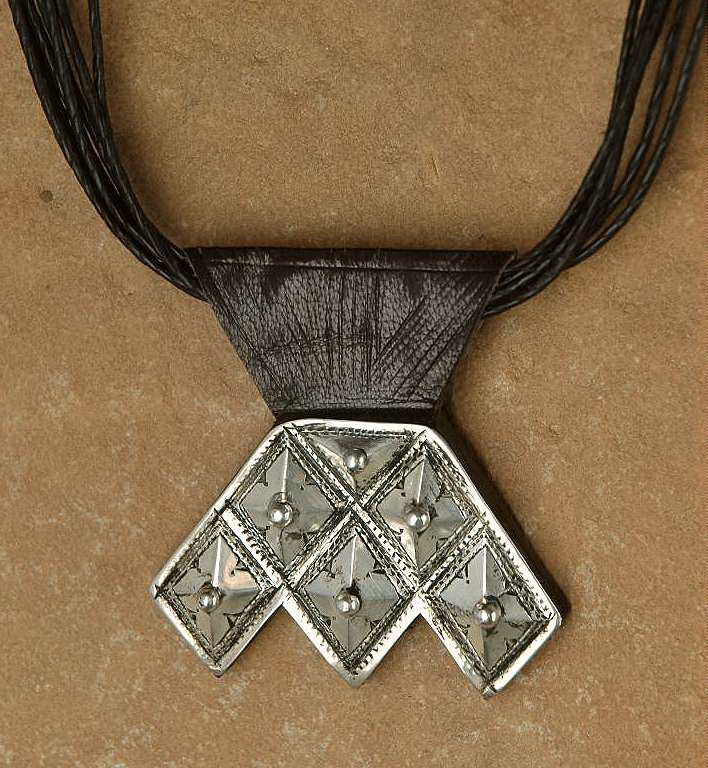 Dem Glauben der Tuareg nach hilft bei diesem Schmuckstück die fünffache Anordnung der rautenförmigen Silberelemente, den Träger vor Bösem zu bewahren.