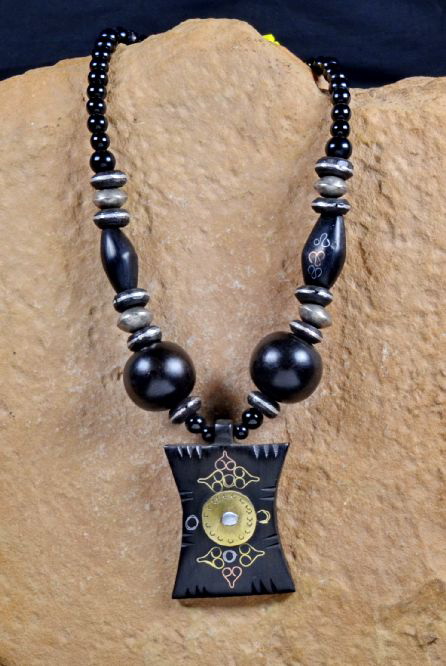 Der Ebenholzanhänger ist schön gearbeitet und mit Kuper, Messing und Bronze Einlagen verziert. Bei den Holzperlen wird entweder Ebenholz mit eingefügten Silberscheiben verarbeitet, oder es werden Metallfäden in die Holzperlen ( Kupfer, Messing, Bronze usw. ) eingeschlagen.