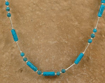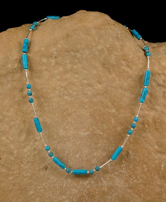 Diese Halskette ist zeitlos elegant und mit schönem Türkisperlen und Silberhülsen und Perlen gefädelt.