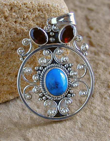 Extravaganter Silber Anhänger - Türkis mit Granat
