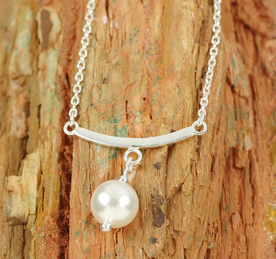Diese moderne Halskette ist aus glänzendem Silber gearbeitet, vorne hängt eine schöne Perle.